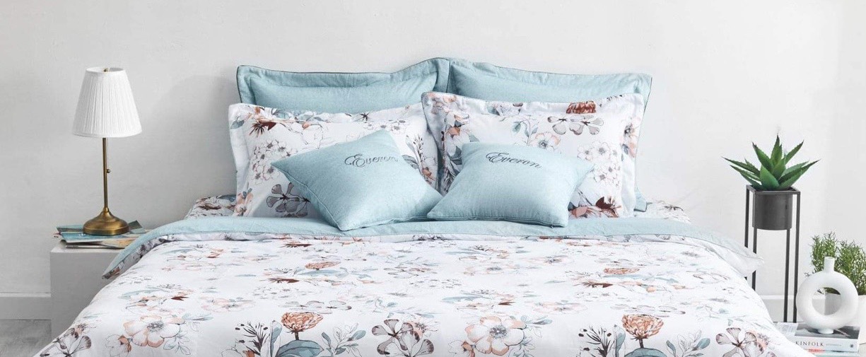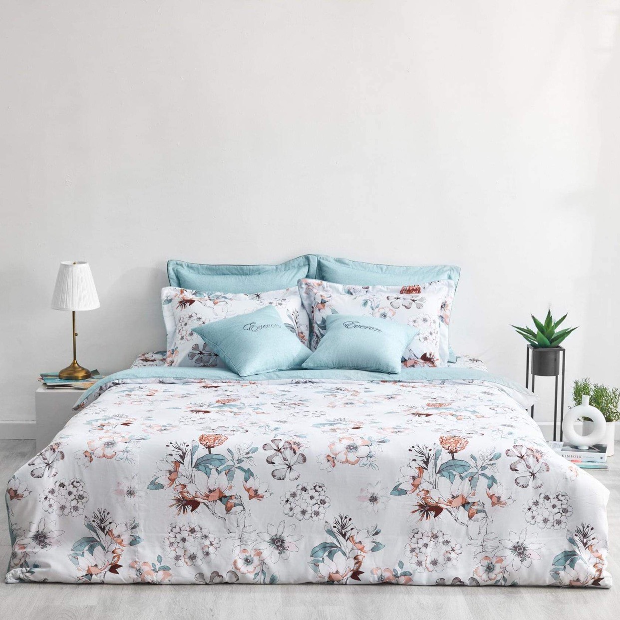 Bộ chăn ga gối này được may bằng vải Modal, loại vải có nguồn gốc từ gỗ sồi với nền trắng cộng với màu xanh da trời ở những chiếc gối tạo nên tổng thể hài hòa, dịu mát và không kém phần sang trọng, nổi bật.