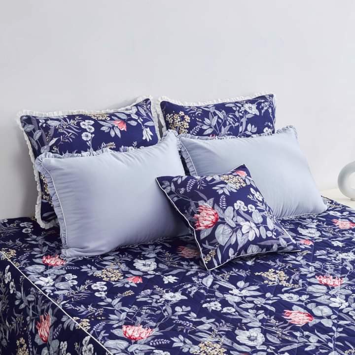 Nếu bạn e ngại gam màu sáng thì bộ sản phẩm này là lựa chọn tối ưu cho bạn đó. Với gam màu xanh thẫm thì mẫu thiết kế này có vẻ chìm hơn. Tuy nhiên các nhà thiết kế đã khéo léo lồng ghép họa tiết hoa lá to bản đan xen phủ kín bề mặt sản phẩm.