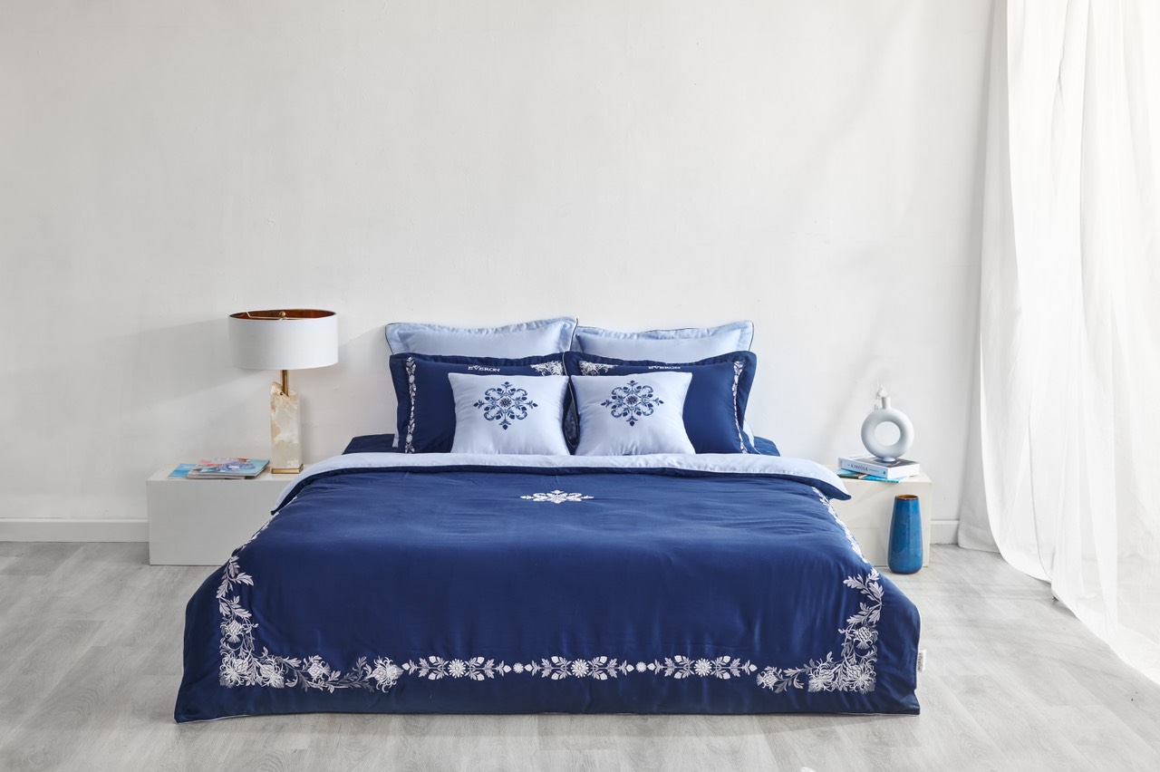 Những sự điểm xuyết ngẫu hứng đôi khi lại mang đến hiệu quả bất ngờ. Những cành hoa nhỏ xinh đặt ngẫu hứng trên nền vải tencel màu xanh dương, không sắp đặt cầu kỳ nhưng lại khiến người dùng cảm nhận tốt nhất sự mềm mịn bay bổng của dòng vải thiên nhiên này đem lại. Hiện đại, nhẹ nhàng và tinh tế là những điều bạn có thể tìm thấy ở bộ chăn ga này.